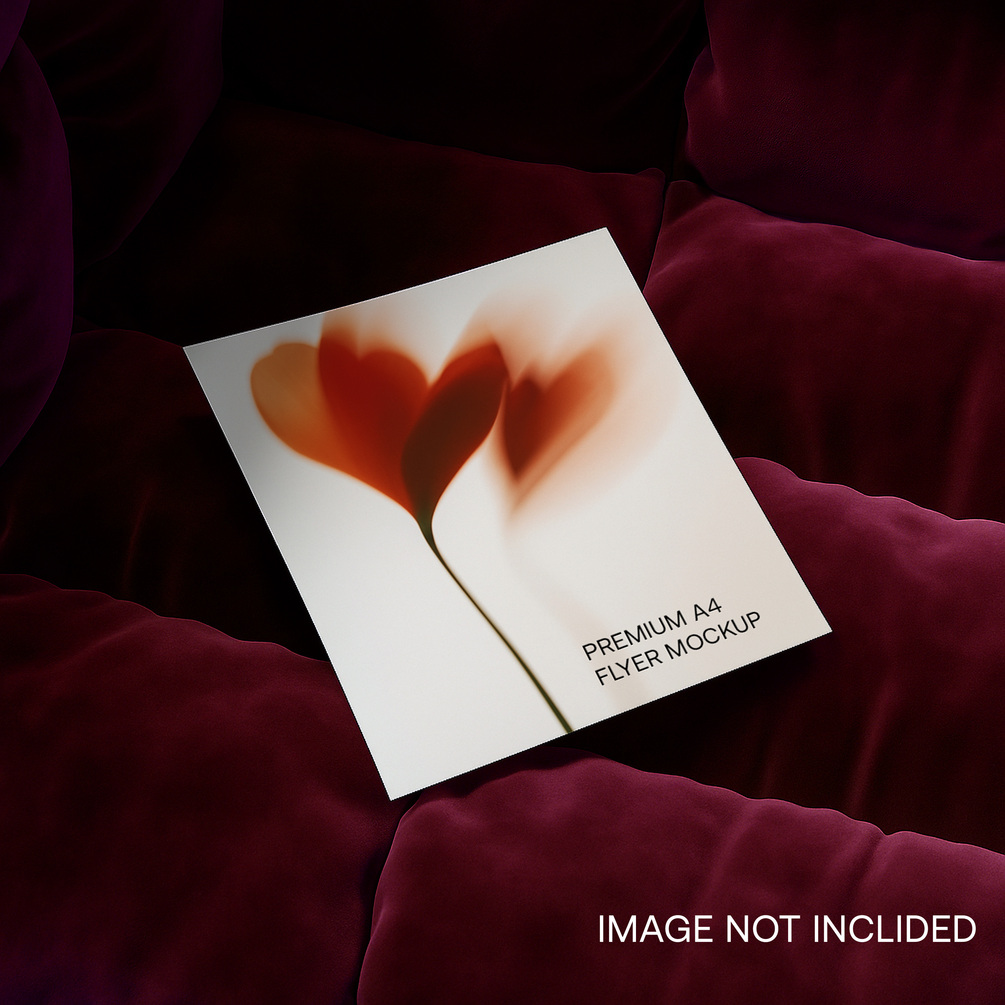 Present your flyer designs with a touch of luxury using this high-quality A4 flyer mockup. Displayed elegantly over rich, deep red velvet cushions, the mockup offers a sophisticated and warm ambiance—perfect for showcasing premium branding, event promotions, or artistic prints. The soft shadows and blurred lighting add a dreamy, editorial-style effect, making your flyer stand out in any presentation.